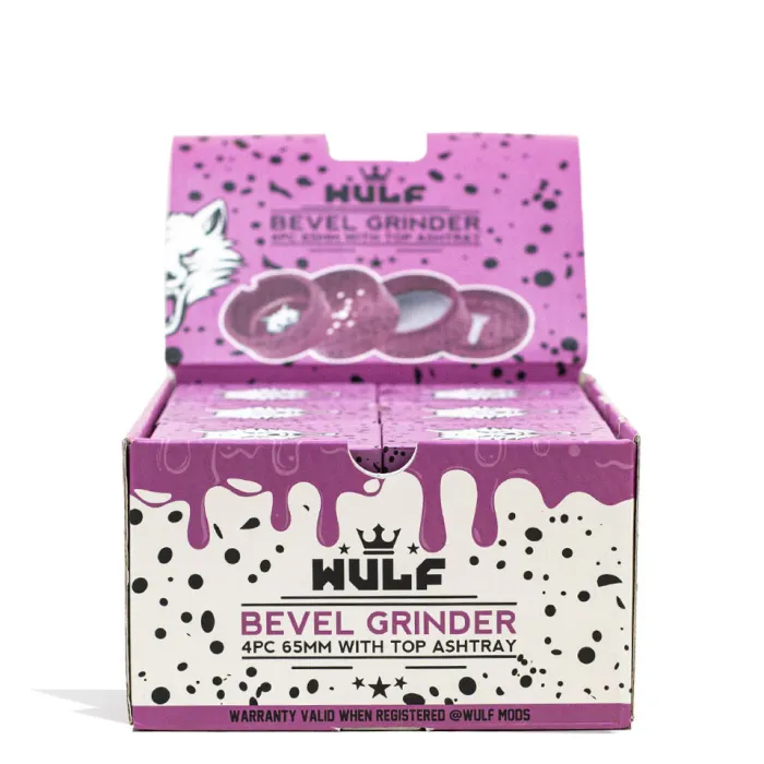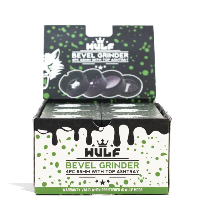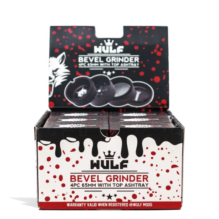 The Wulf Mods 4pc 65mm Bevel Grinder with Top Ashtray 6pk is here to make sure your stock is fully loaded with some of the best dry herb accessories around. The Bevel Grinder 6pk comes in a point of sale ready packaging, where all you have to do is open it and it’s ready to display on the shelf with a bespoke graphic showing all 4 pieces of its shredding excellence. The Grinders themselves have been expertly designed in California and employ an innovative spiked diamond teeth shredding system to grind dry herbs easier than ever.