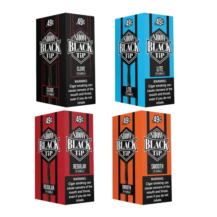 The Brand Show Black Product Tip Cigarillos offer a premium smoking experience with a display box containing 25 count cigarillos in five distinct flavors: Chocolate, Clove, Regular, Lite, and Smooth. Each flavor is crafted to provide a unique taste profile, catering to diverse preferences and enhancing enjoyment. The sleek design and quality construction ensure a satisfying draw, making these cigarillos an excellent choice for both casual smokers and connoisseurs alike.