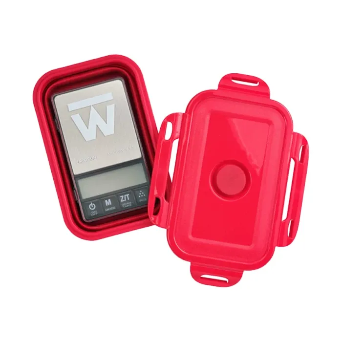 These Crimson digital scales include a large collapsible silicone bowl and latching cover for incredible versatility. The silicone bowl contains and protects the scale when collapsed, keeping it safe from knocks and bumps. When fully expanded, the bowl provides a comfortably large volume for weighing items. Results are easy to read from the extra-large LCD with white backlight. Built-in overload protection helps prevent damage to the scale. Other features include automatic Piece Counting, power-saving Auto-Off after 3 minutes of inactivity, Tare/Zero feature for subtracting the weight of a container or expansion tray, and easy One-touch Calibration. Each scale comes with two AAA batteries and a user's manual.